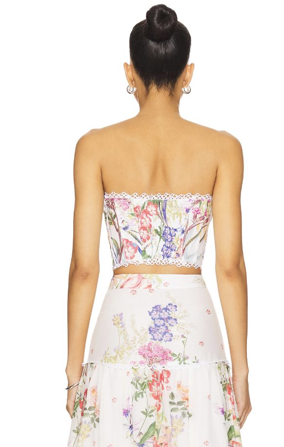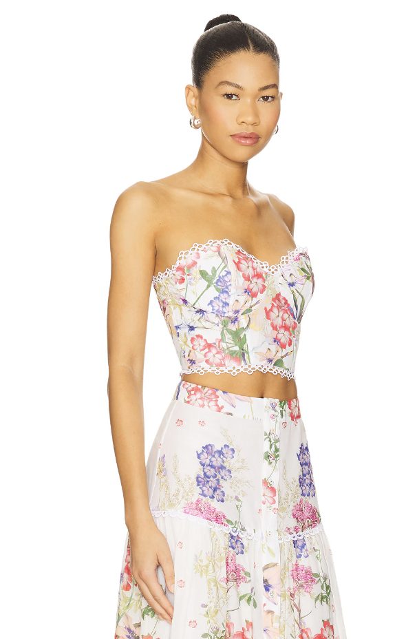 The Bio Set by Charo Ruiz is a statement in refined femininity and resort elegance. Crafted in lightweight cotton voile with an exclusive garden print, this two-piece set includes a strapless corset-style crop top and a matching high-waisted tiered maxi skirt. Featuring delicate lace trim and thoughtful tailoring, this look flows effortlessly from daytime events to sunset soirées.