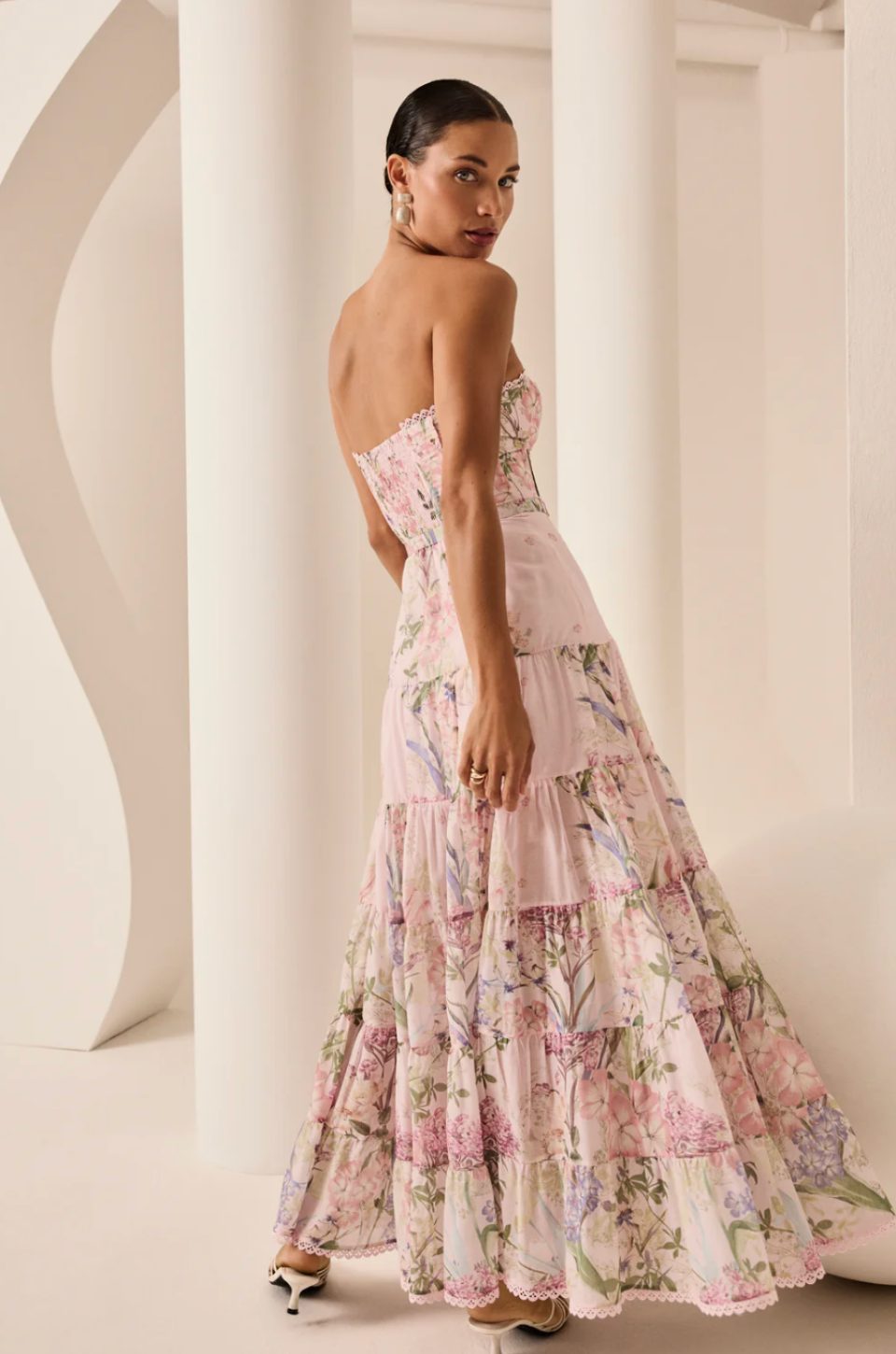 This strapless maxi dress embodies soft femininity with its delicate floral print and flowing tiered silhouette. The fitted bodice gently contours the upper body, while the smocked back ensures comfort and flexibility.The skirt cascades into layered tiers, creating volume and movement with every step. Finished with subtle lace trims, this piece is perfect for resort escapes, summer celebrations, and destination occasions where elegance meets ease.