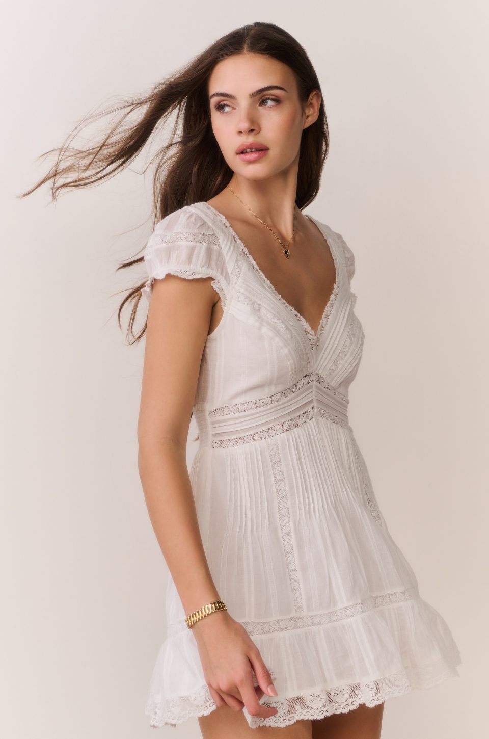 This white lace mini dress combines delicate detailing with a flattering silhouette. Designed with a soft V-neckline and lace trim, it features a fitted bodice that flows into a lightly tiered skirt.