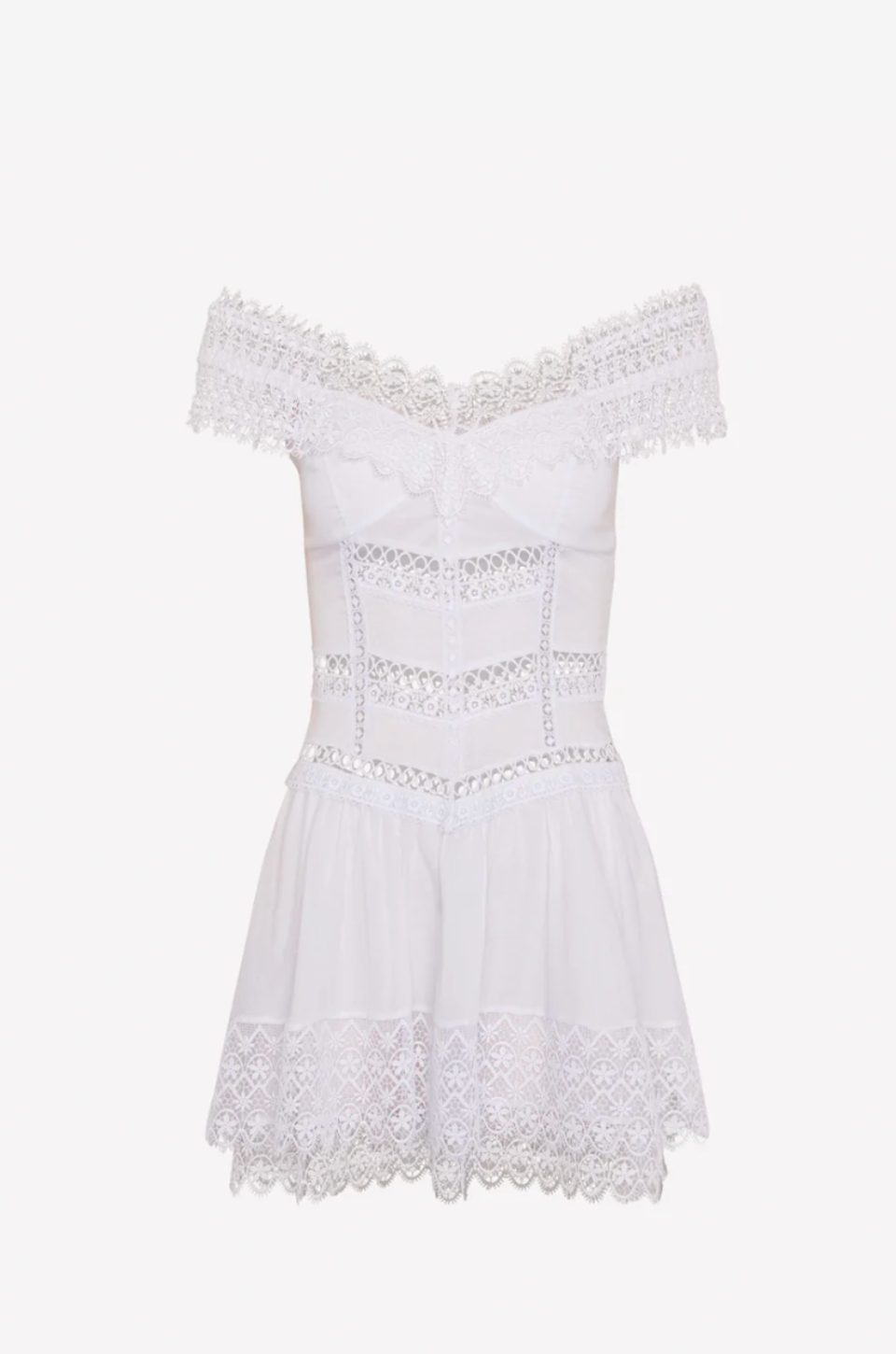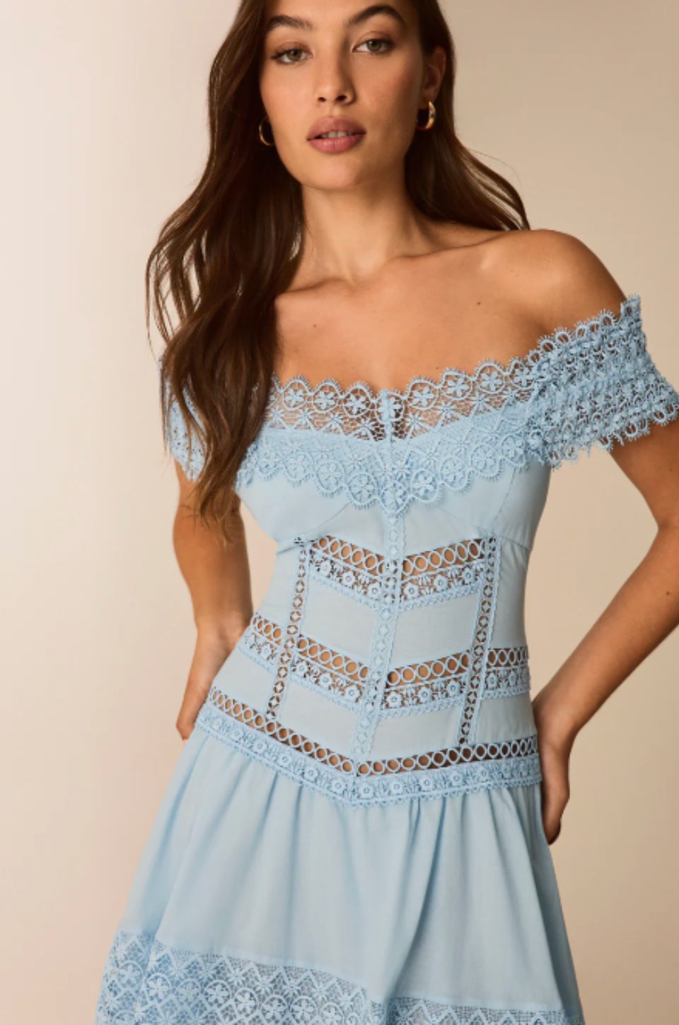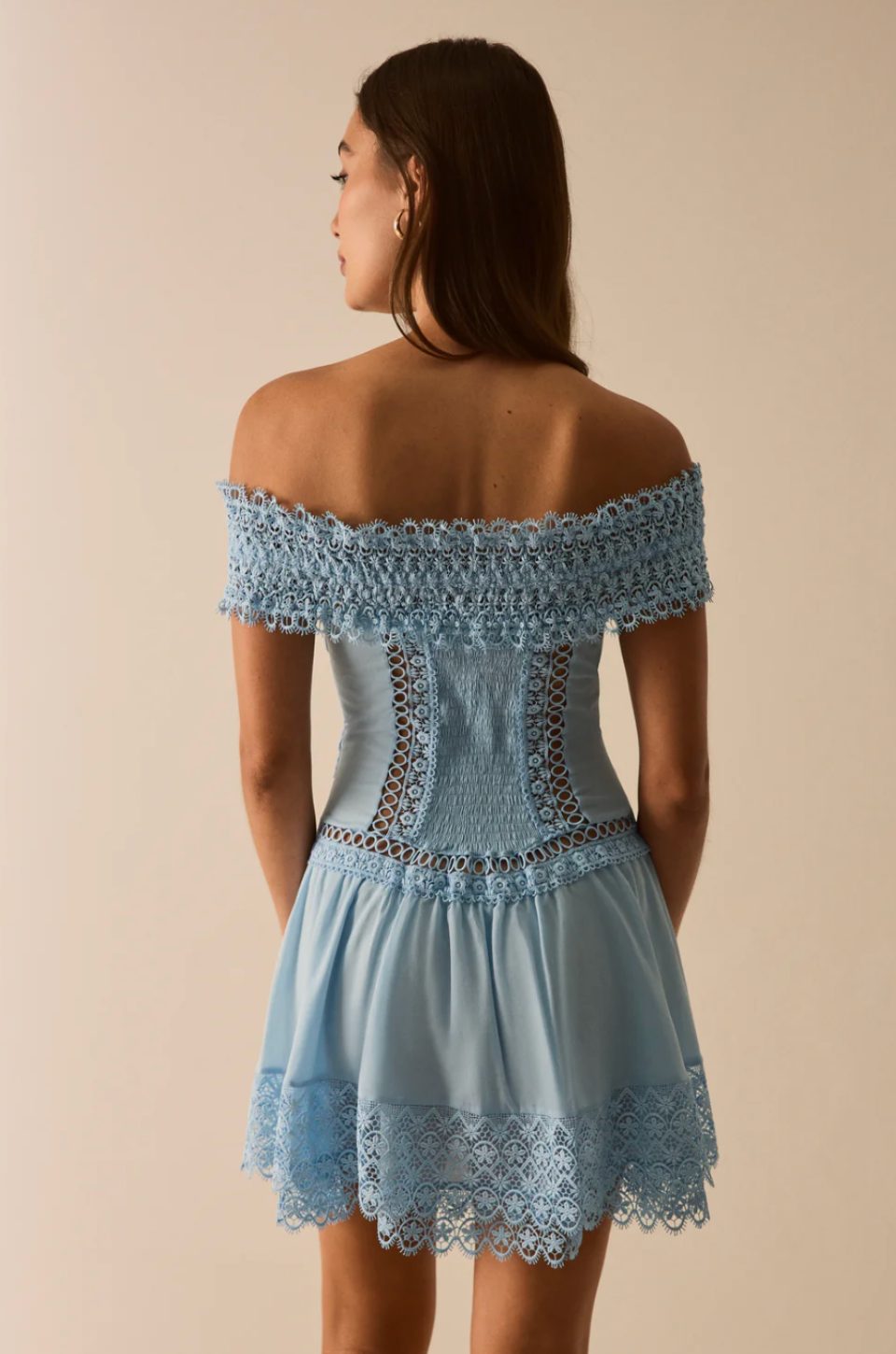 Eliane dress blends romantic lace with a sculpted, feminine silhouette. Designed with an off-shoulder neckline, it features delicate lace trim that softly frames the collarbone and shoulders. The structured bodice is detailed with intricate openwork panels, creating texture and dimension while enhancing the shape of the waist.