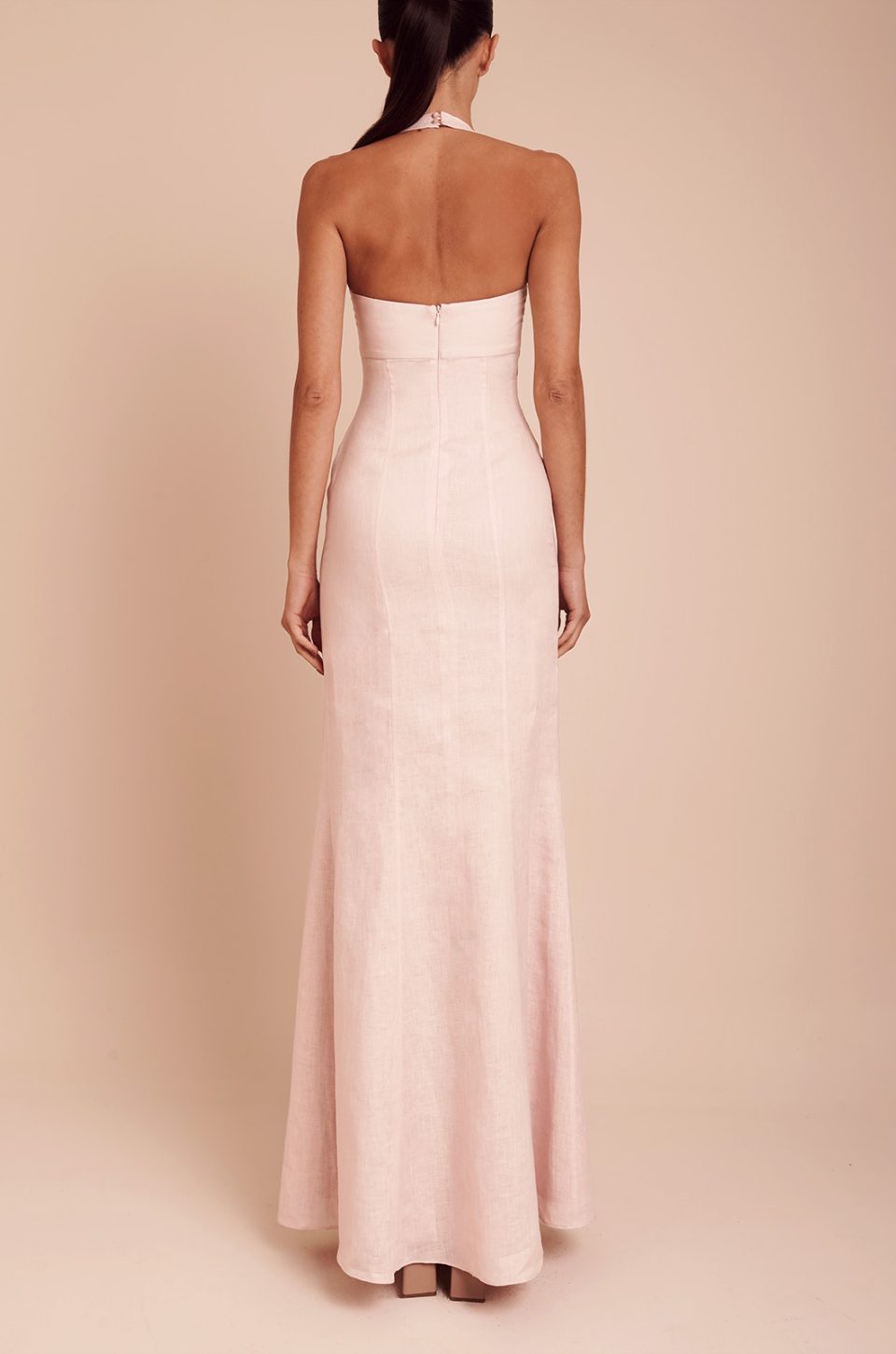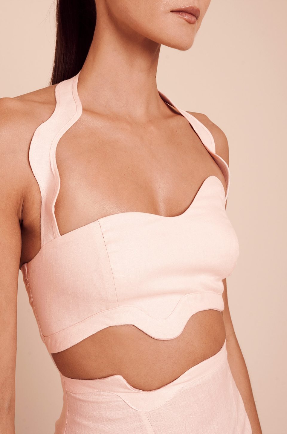 Elegant and sculptural, this blush pink two-piece set blends modern design with timeless femininity. The halter-style crop top features a softly structured bodice with a delicate scalloped neckline that highlights the décolletage while offering a flattering, supportive fit. A subtle cut-out at the waist creates a refined and contemporary silhouette, adding dimension without overpowering the look.
