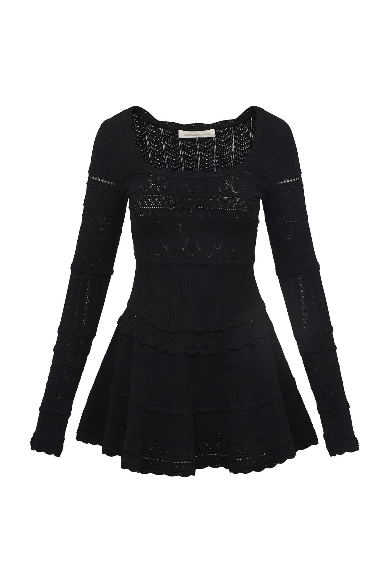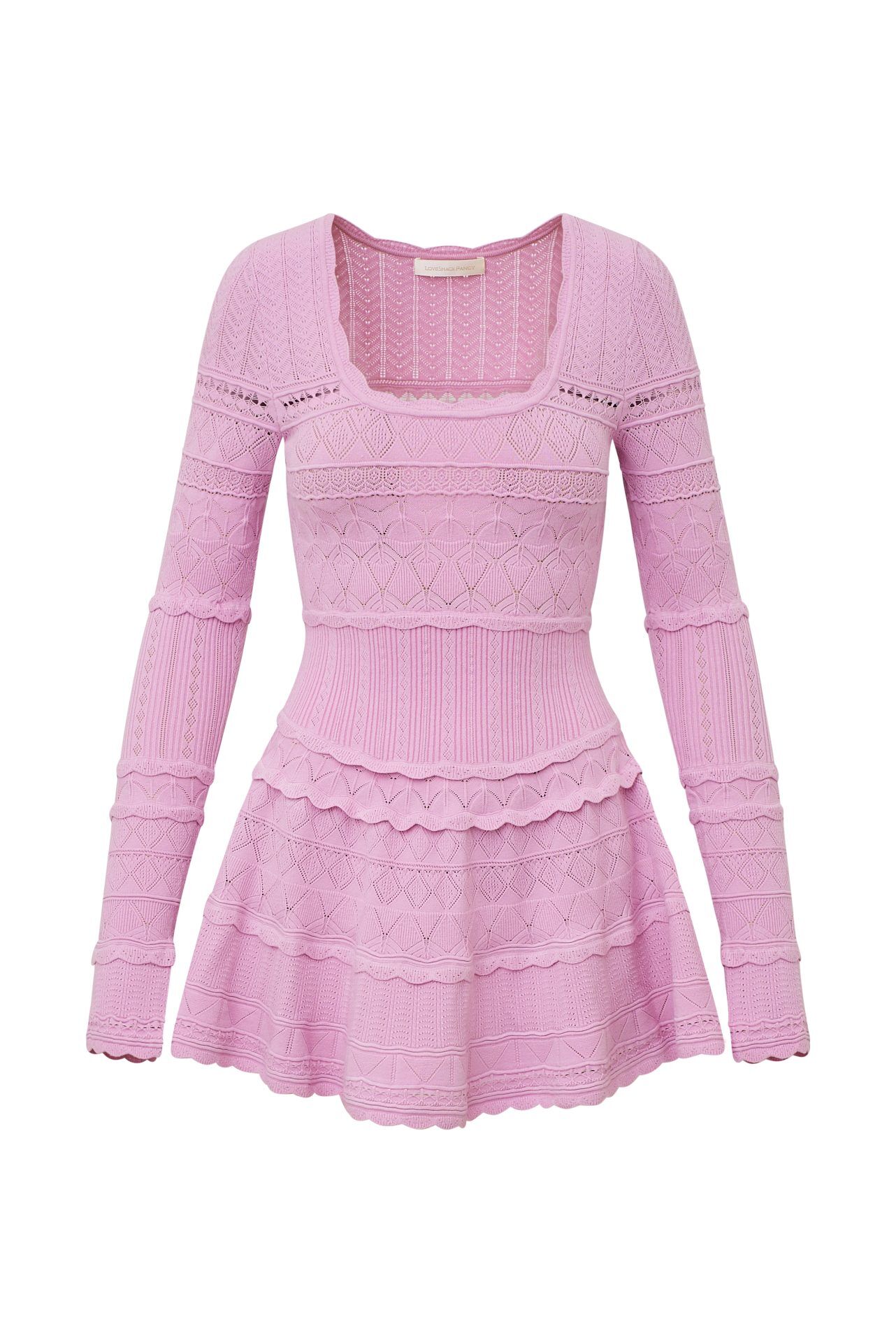 The Lavender Dress by LoveShackFancy is crafted from a delicate stitch pointelle knit fabric and combines cozy comfort with effortless chic. Featuring intricate embroidery throughout, it boasts long, slim sleeves, a square neckline, and a flattering, body-skimming bodice that flows gracefully into a breezy skirt.