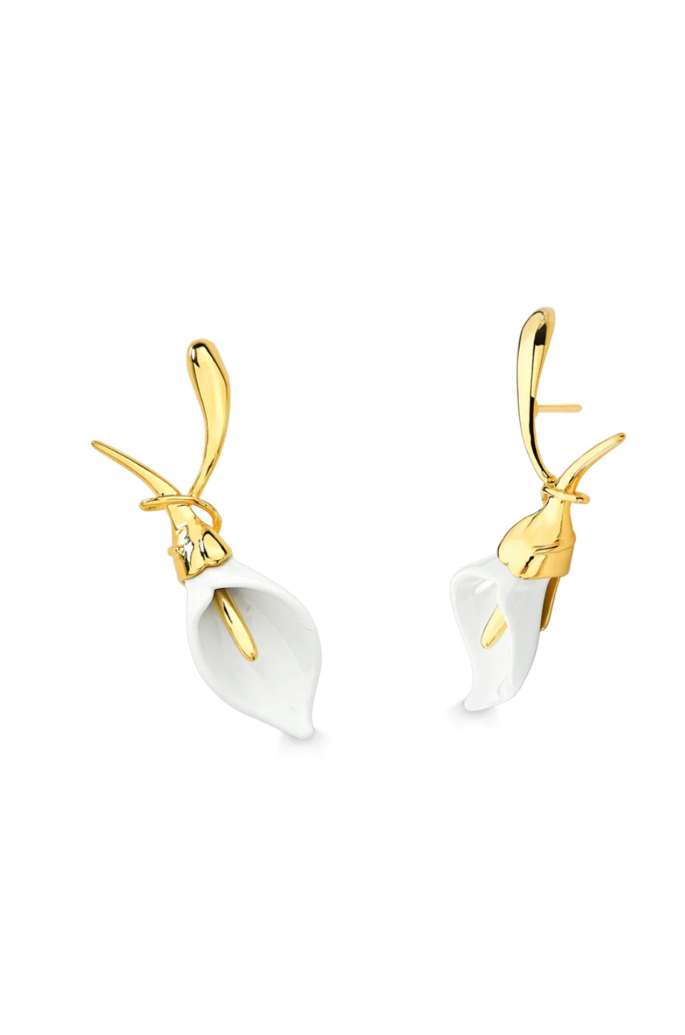 The Lily Earrings feature sculpted white lily flowers accented with polished gold details, bringing a romantic and elegant touch to any look.