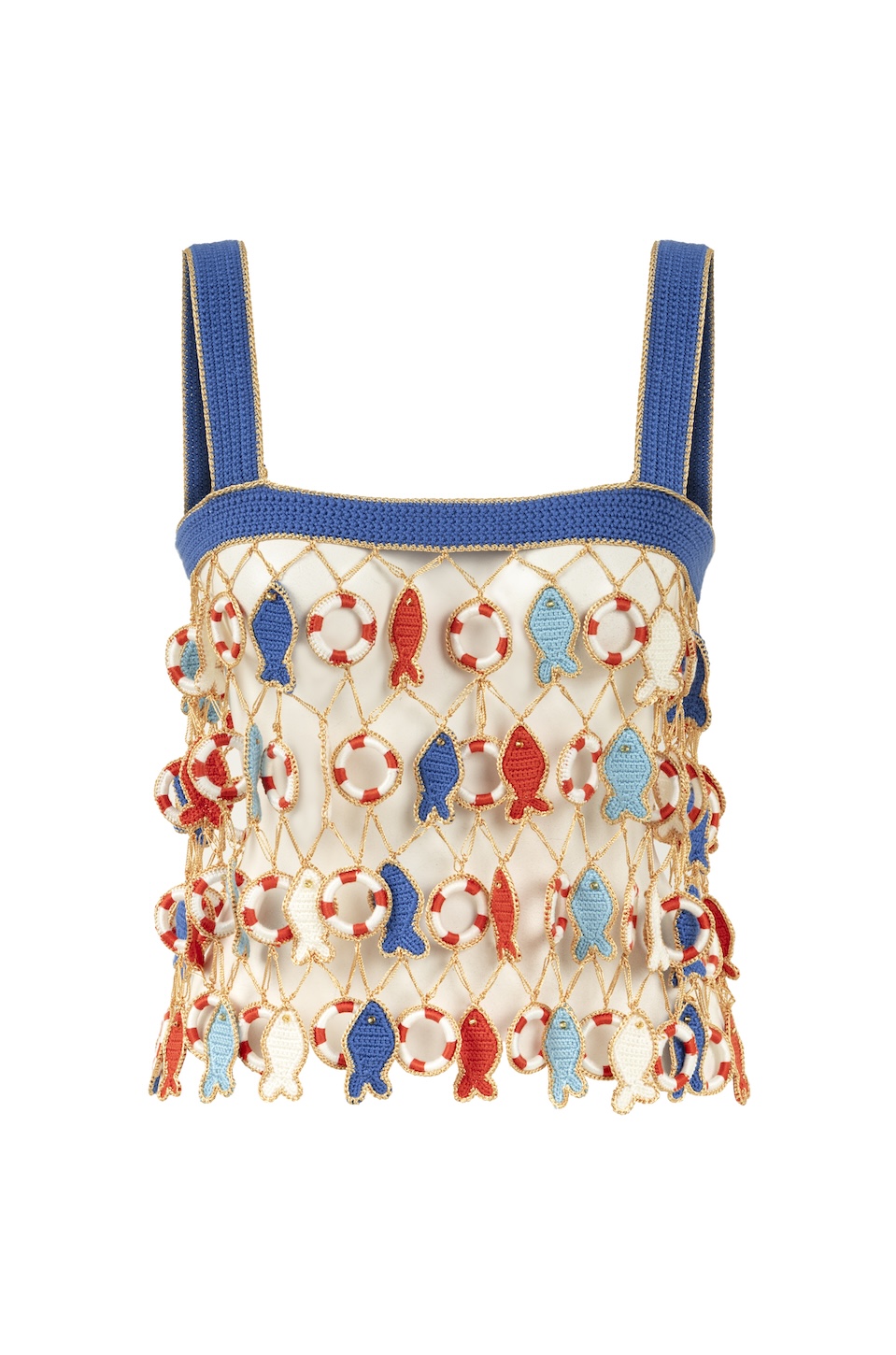 The high-waisted pants design is accentuated with delicate hand-crocheted lifebuoy embellishments and an elegant rope-tie detail, adding a touch of maritime-inspired artistry. Designed with a structured square neckline and bold blue straps, this top is elevated by an open netted crochet layer, embellished with meticulously crafted lifebuoys and colorful fish charms. Each piece is handcrafted, making every top a unique expression of resort-ready luxury.
