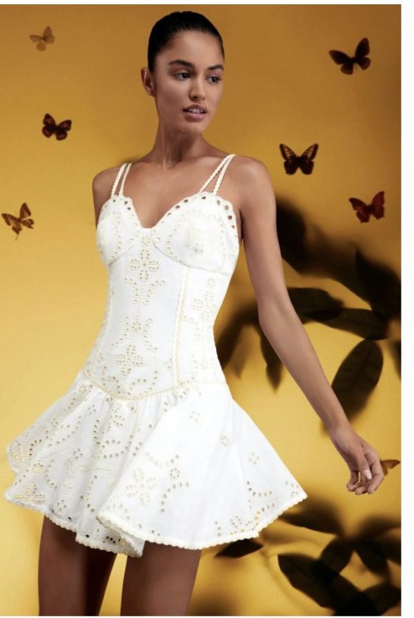 The Sissy Short Dress by Charo Ruiz showcases a feminine silhouette with its flattering, fitted bodice that elongates the silhouette and hugs the body beautifully. Made with gorgeously placed embroidered linen, the piece finishes with a delicate scalloped neckline and a flounced skirt.
