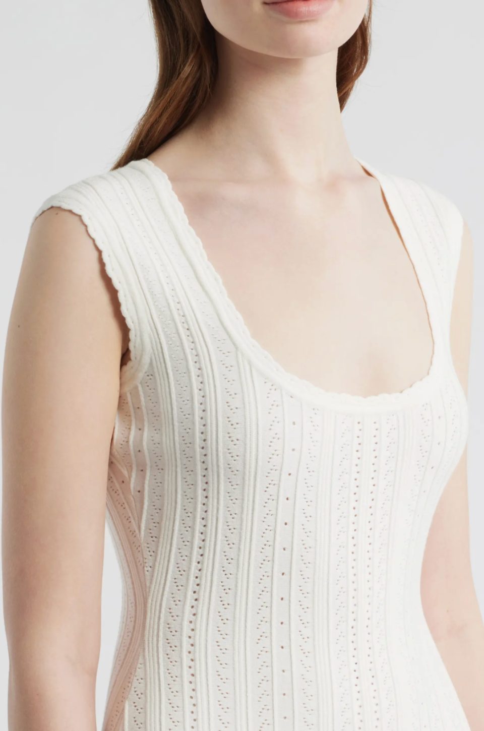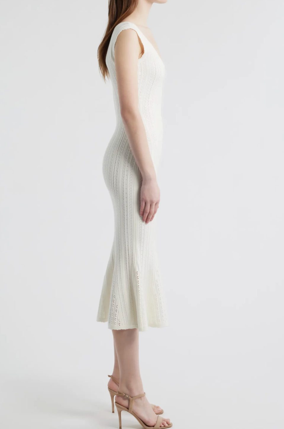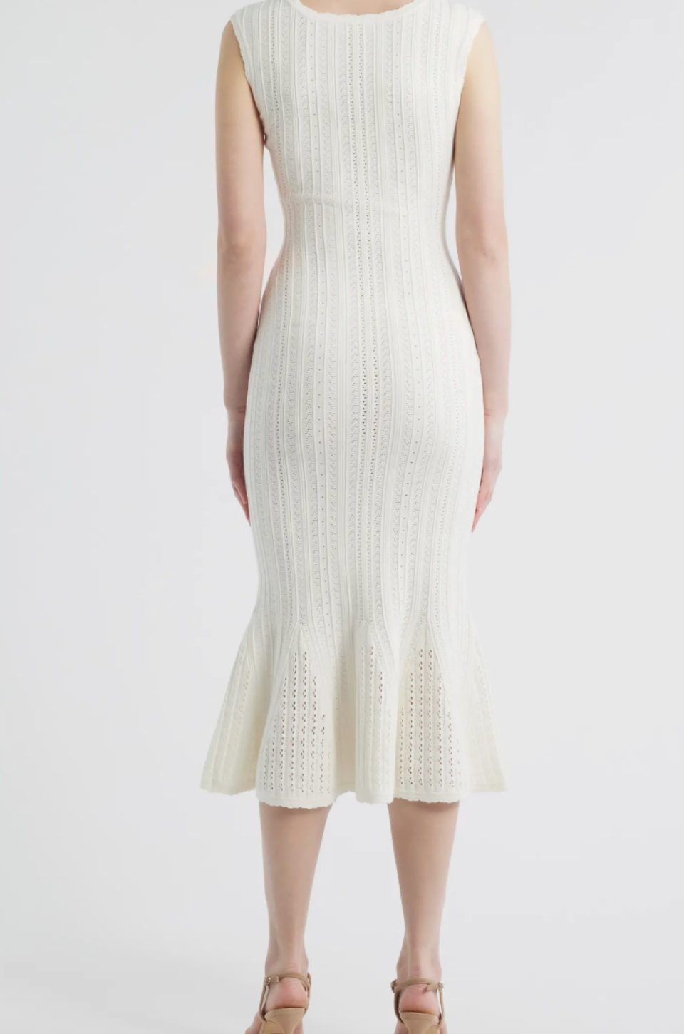 White knit midi dress with a fitted silhouette and flared hem. Minimal and sculpted.