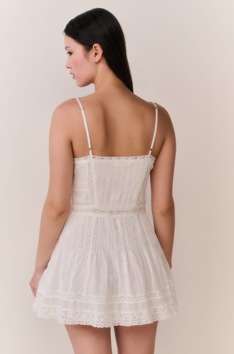 This white mini dress features delicate lace paneling and subtle front button detailing for a refined, feminine look. The fitted bodice enhances the shape, while the soft skirt adds light movement.